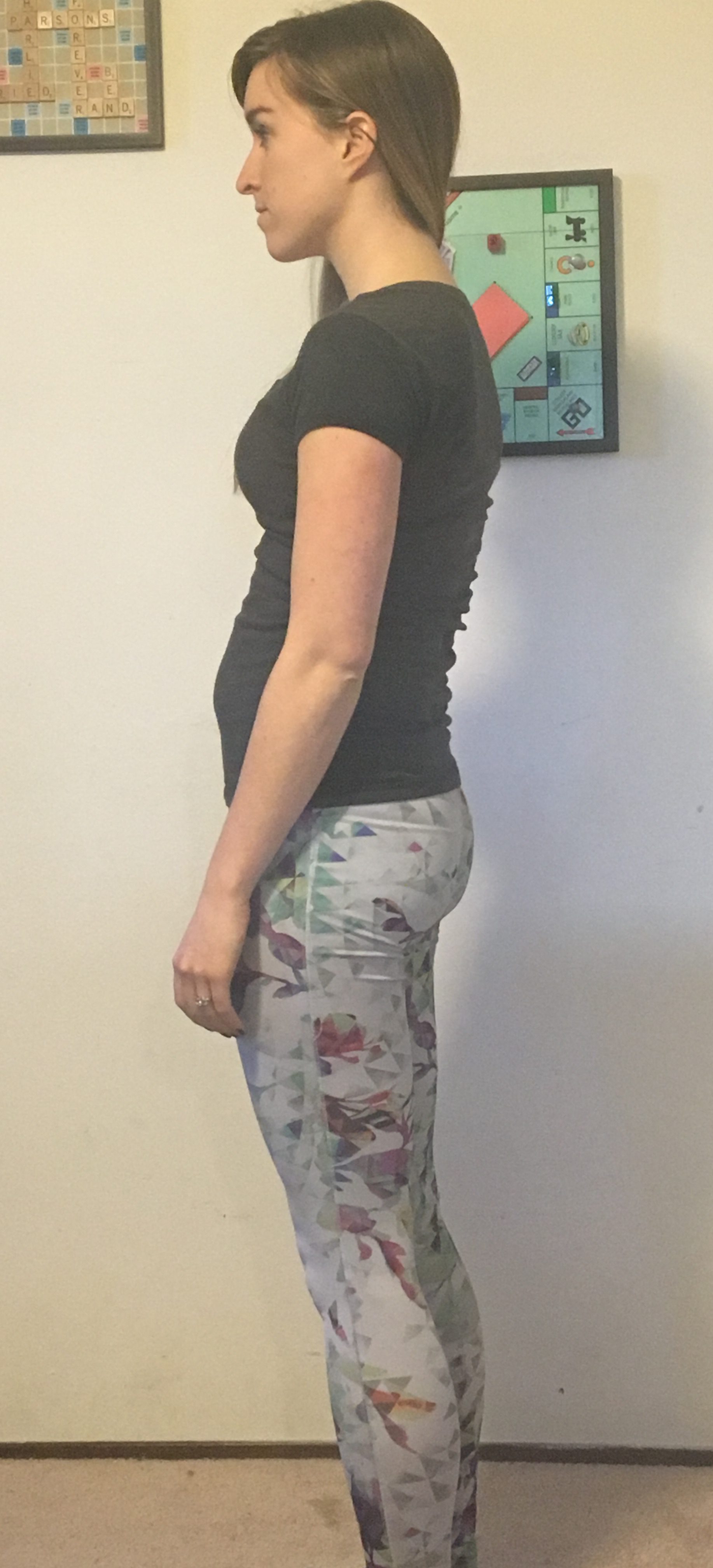My head is higher and not so far forward, my spine is in better alignment, and my hips are further back. My pelvis tilts less (still have a ways to go) and shoulders still roll forward but not quite as much!